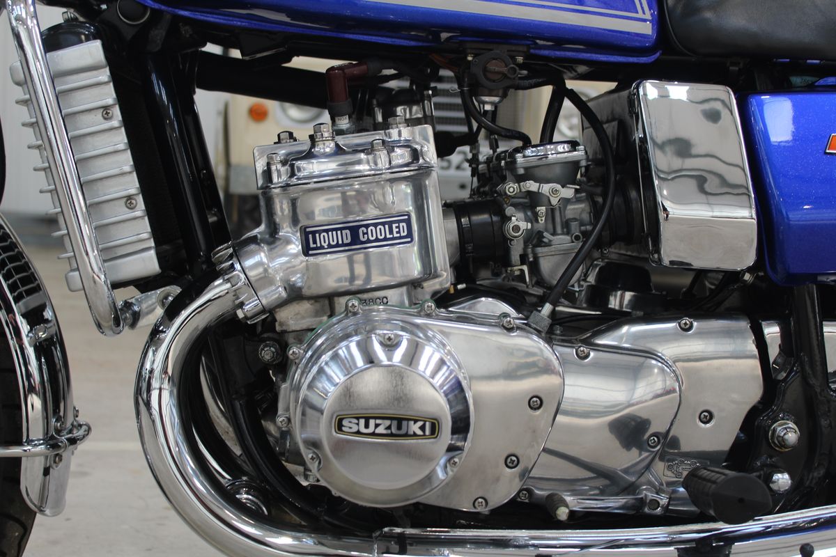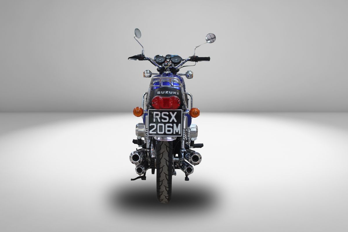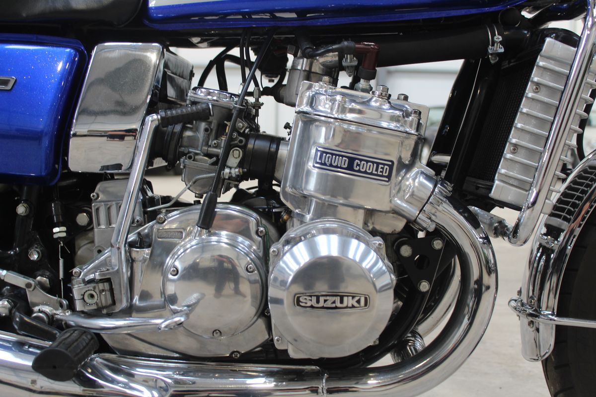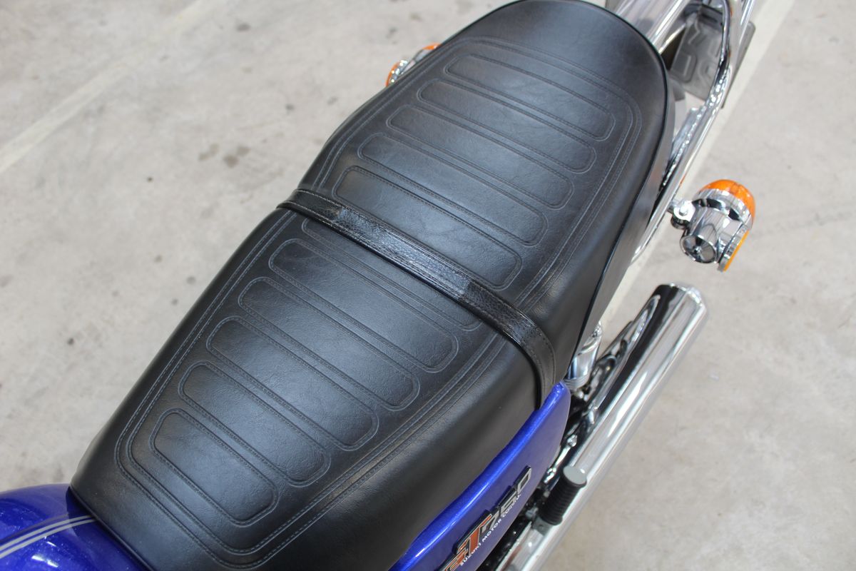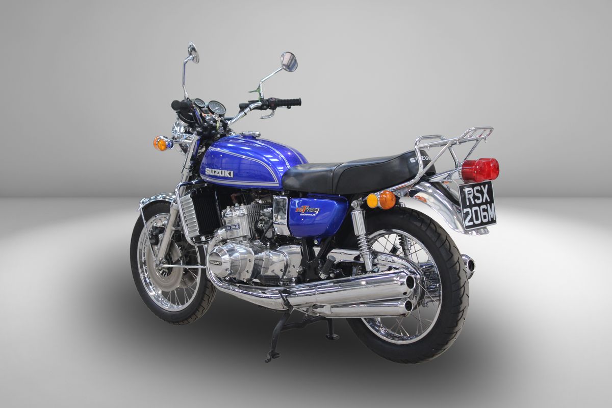 A stunning example of the popular Suzuki GT750, this 1974 model. RSX206M is finished in Metallic Blue with a Black seat and chrome detailing. A well-sorted example of Suzuki’s legendary water-cooled bike.